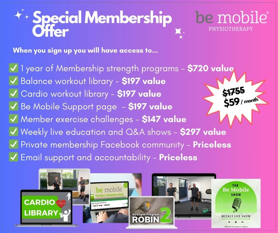 The Be Mobile Online Membership is backed by our 30-day 100% money back guarantee so you have no risk... And everything (including strength and fitness) to gain!